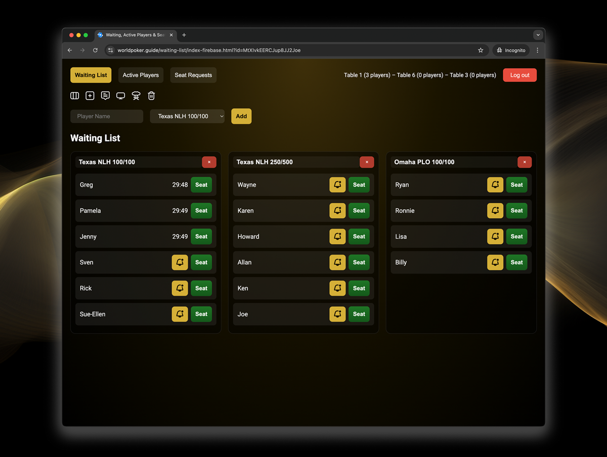Behind the Scenes for Staff On the dealer’s side, the admin console is your command center. See at a glance exactly who’s on the waiting list, which tables have open seats, and who’s next in line. Drag‑and‑drop players into open seats to instantly update both the floor display and everyone’s phones. Need to bump a VIP or reorder by buy‑in level? Just click and drag—the list reorganizes in real time. And because it’s browser‑based, you can run it on any device: PC, tablet or even a wall‑mounted kiosk.